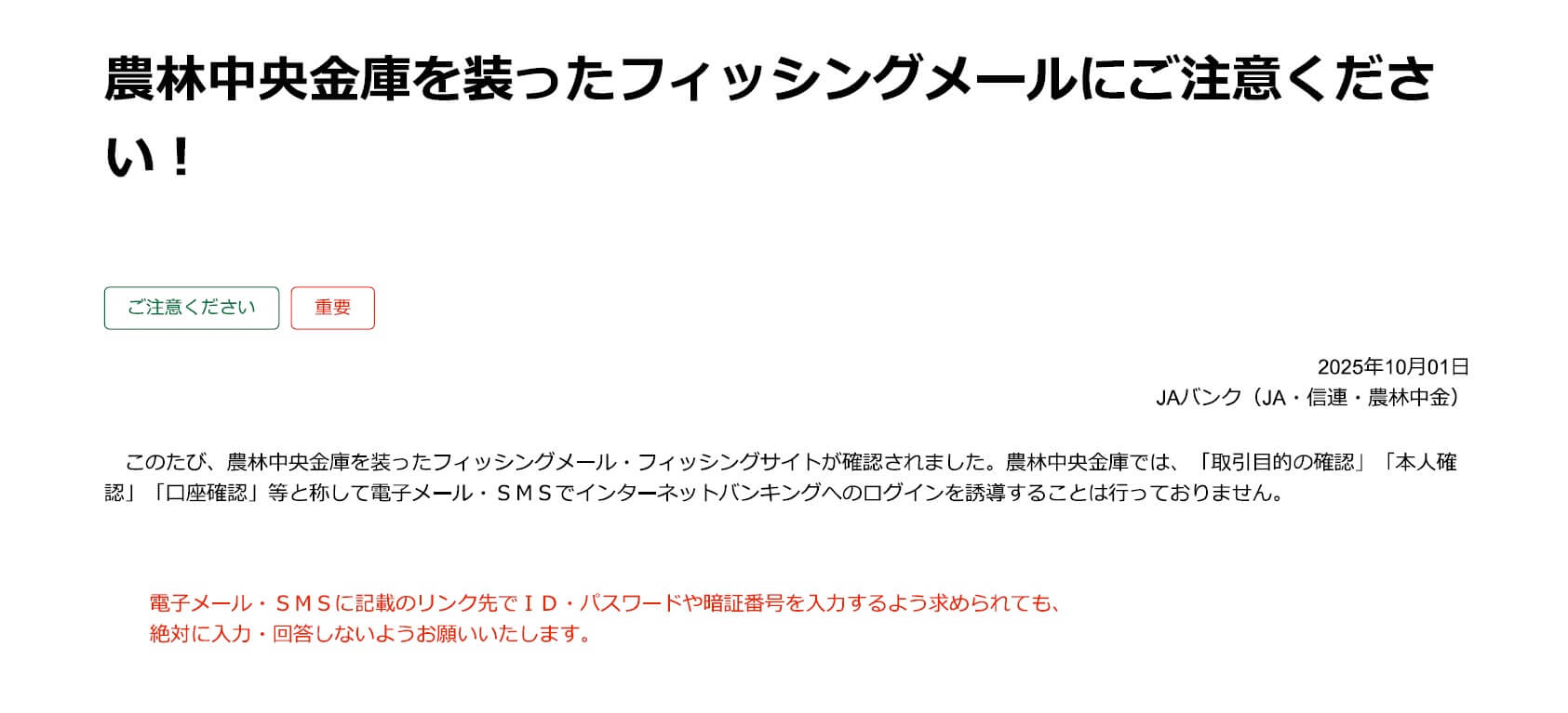 【注意喚起】農林中央金庫を装った不審な電子メールについて