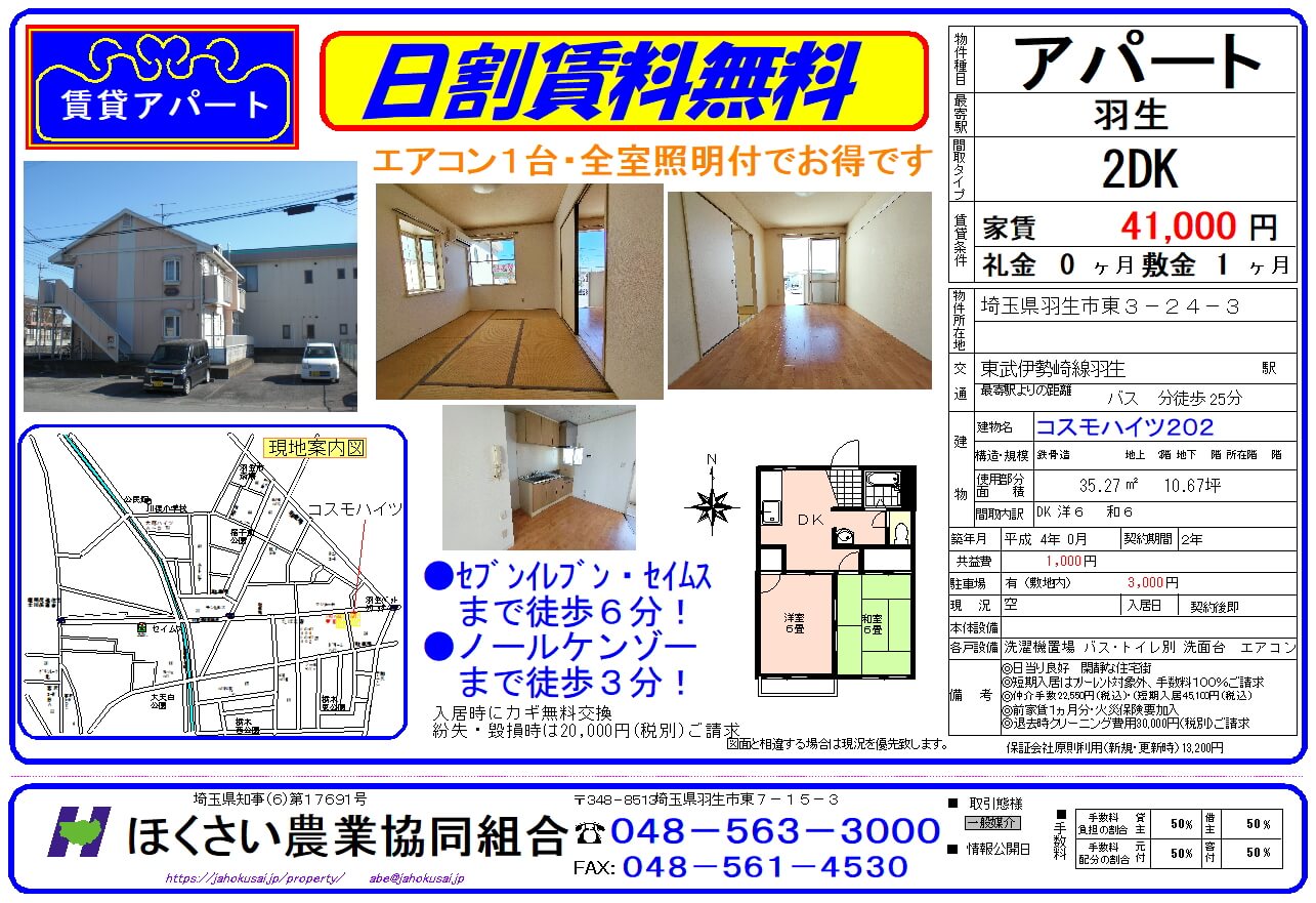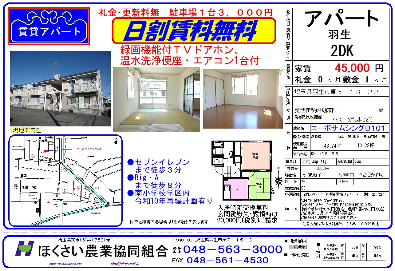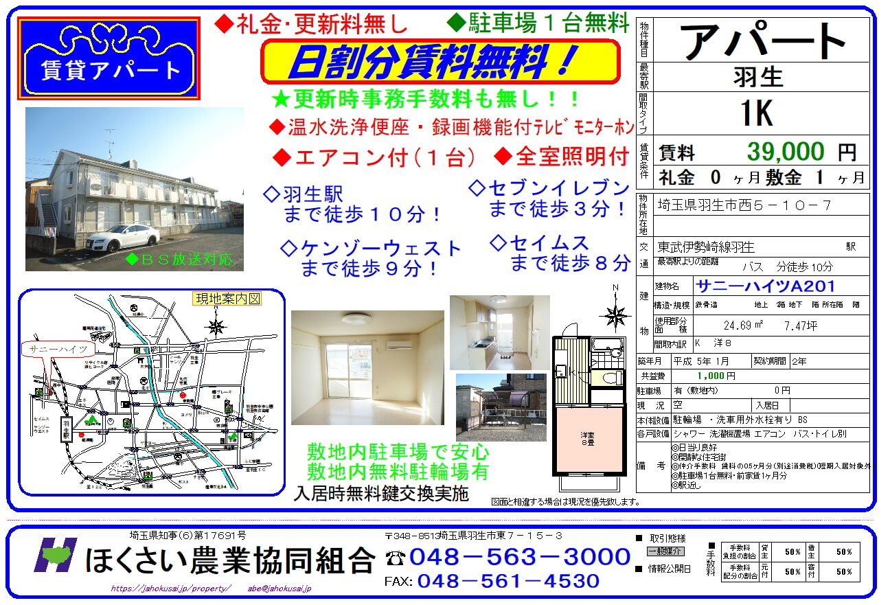 JAほくさいでは、皆さまが安心・安全にお住まいできる、羽生市・加須市・行田市のアパート情報を扱っております。