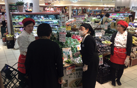 このキャンペーンは、出荷先の東京青果株式会社からの依頼を受けて行ったもので、武蔵浦和駅のショッピングセンターの店頭に立った2名が6等分に切った試食を配布しました。