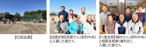 11月19日は、行田支部(大澤邦夫支部長)が行田市総合公園で行いました。会員83名が参加し、南河原支店管内の松島清さんが優勝しました。また、91歳で参加した行田南支店管内の戸塚よし子さんには最高年齢賞が贈られました。