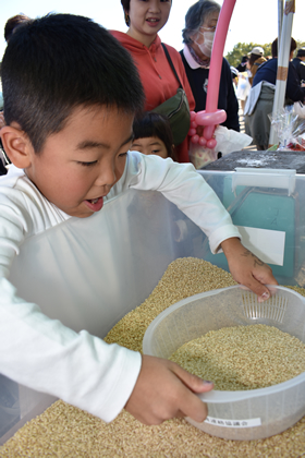 管内行政とJAなどで組織する同会。ブースでは、「彩のかがやき」と「彩のきずな」の食べ比べアンケートを行いました。名前を伏せたままの新米を一口ずつ配り、どちらの品種が好みかを募りました。それぞれ、「甘い」「もちもちしている」と歓声をあげながら味見した参加者。90対58で、彩のかがやきに軍配があがりました。